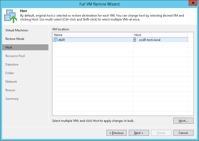 The Host step of the wizard is available if you have chosen to change the location and settings for the restored VM.