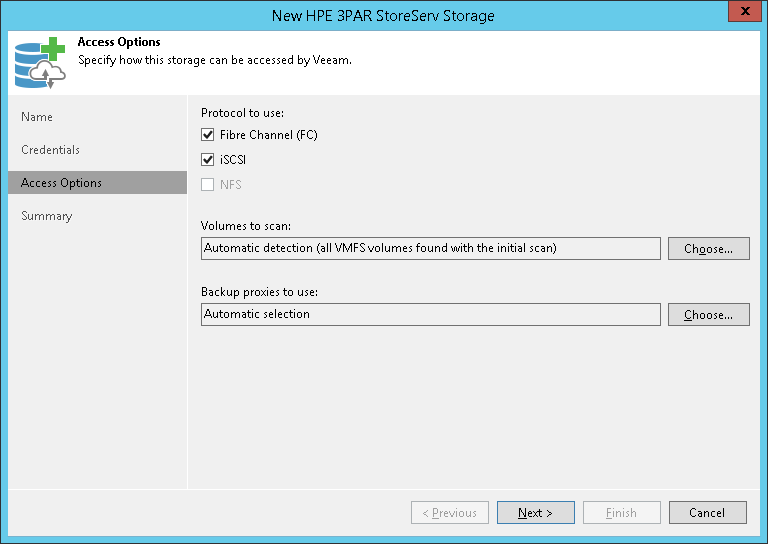 - Operations of storage rescan and Backup from Storage Snapshots are performed with the help of a backup proxy. On the right of the Backup proxies to use field, click Choose and define backup proxies that you want to use for these operations.