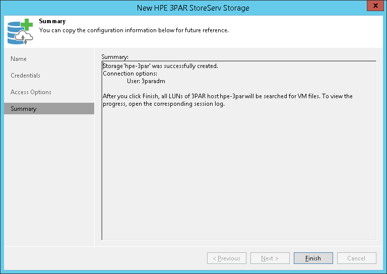 This is an archive version of the document. To get the most up-to-date information, see the current version. Step 5. Finish Working with Wizard In this article At the Summary step of the wizard, review settings of the added storage system and click Finish to start the rescan process.