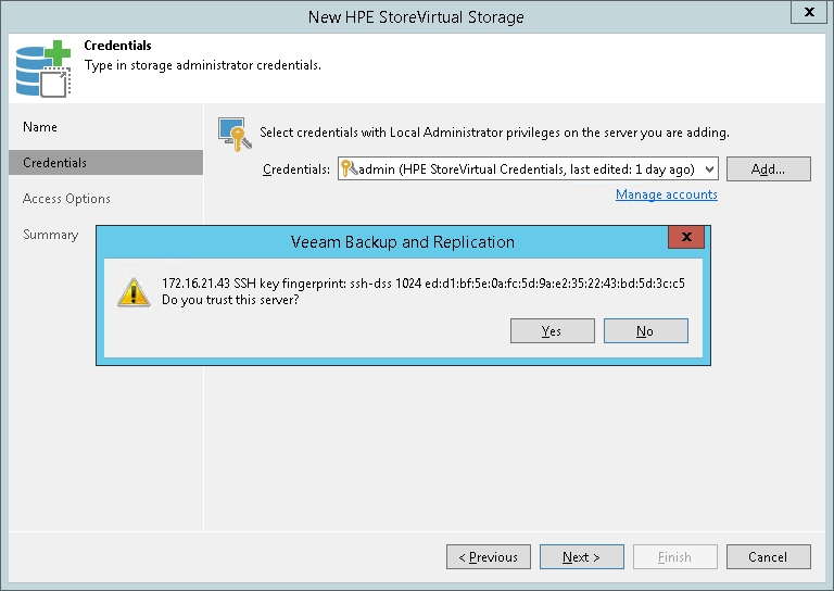 - When you add a storage system, Veeam Backup & Replication saves a fingerprint of the SSH key of the management server to the configuration database. During every subsequent connection to the server, Veeam Backup & Replication uses the saved fingerprint to verify the server identity and avoid man-in-the-middle attacks.