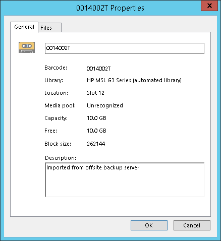 You can view properties of each tape registered in Veeam database. The tapes may be online or offline. The Properties window shows location, capacity, name and other properties of the selected tape.