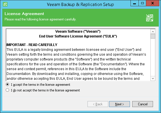 At the License Agreement step of the wizard, you must accept the license agreement for Veeam Backup & Replication. If you do not accept the license agreement, you will not be able to pass to next step of the setup wizard.