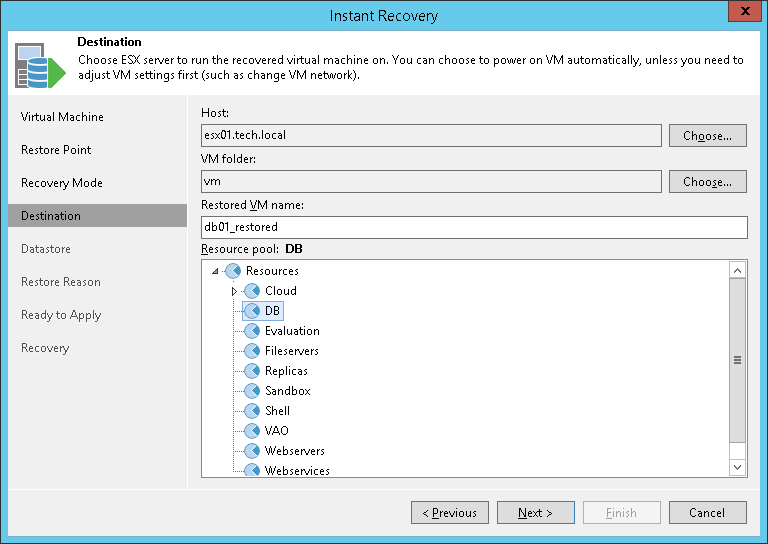 The Destination step of the wizard is available if you have chosen to change the location and settings of the restored VM.
