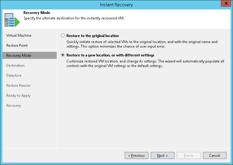 - Select Restore to a new location, or with different settings if you want to restore the VM to a different location and/or with different settings (such as VM location, network settings, format of restored virtual disks and so on). If this option is selected, the Instant Recovery wizard will include additional steps for customizing VM settings.