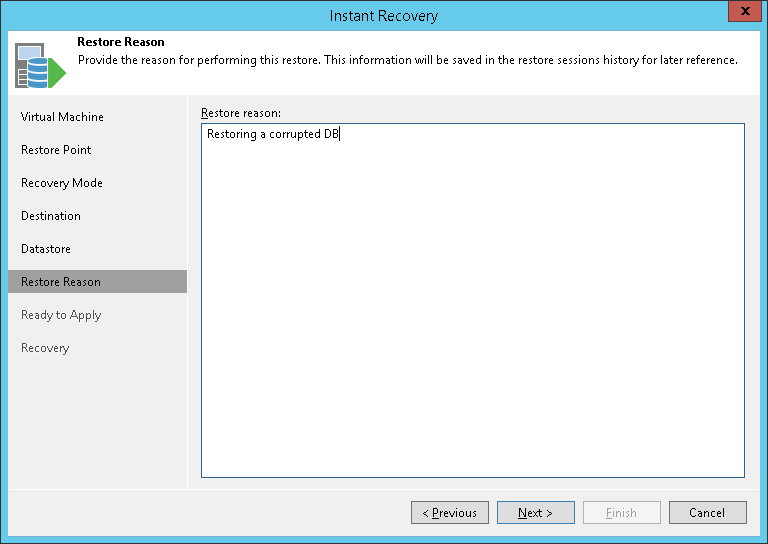 At the Restore Reason step of the wizard, enter a reason for performing Instant VM Recovery for the VM. The information you provide will be saved in the session history and you can reference it later.