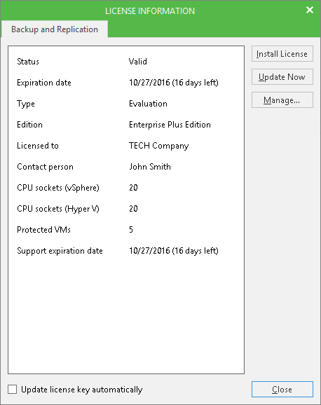 You can update the license manually on demand. When you update the license manually, Veeam Backup & Replication connects to the Veeam License Update Server, downloads a new license from it (if the license is available) and installs it on the backup server.