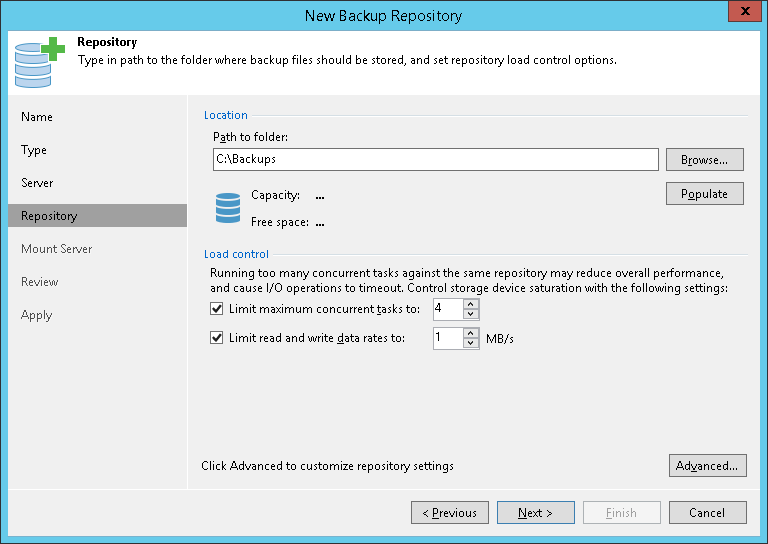Veeam Backup & Replication can limit the speed with which Veeam Backup & Replication must read and write data to/from the backup repository. The data read and write speed is controlled with the Limit read and write data rates to <N> MB/s option that you can enable in backup repository settings.