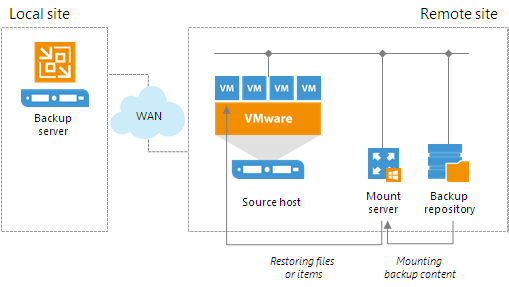 When you perform file-level restore or application item restore, Veeam Backup & Replication needs to mount the content of the backup file to a staging server (or the original VM for restore to the Microsoft SQL Server and Oracle VMs). Once the VM backup is mounted, Veeam Backup & Replication copies files or items to their destination via this mount server or VM. For more information about possible mount points, see File-Level Restore Scenarios.