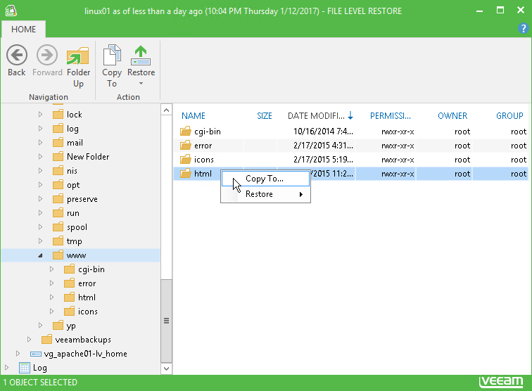 When the restore process is complete, Veeam Backup & Replication opens the Veeam Backup browser displaying the file system tree of the restored VM.