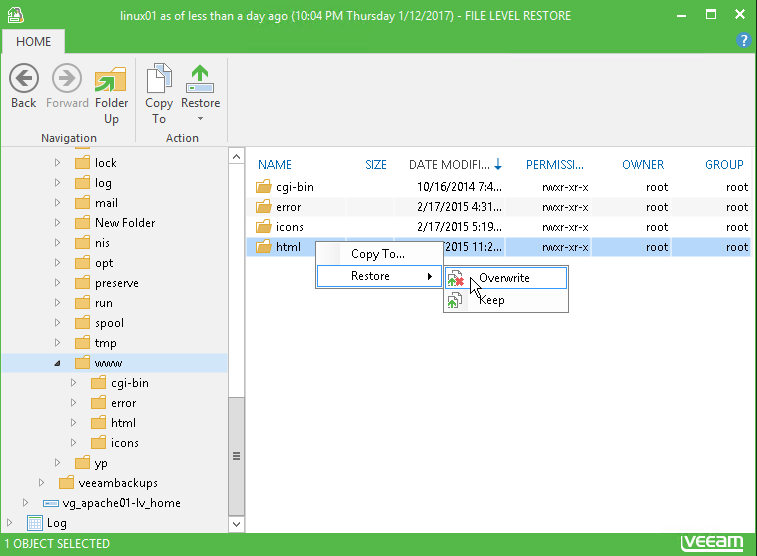 - To save the file restored from the backup next to the original file, select Restore > Keep. Veeam Backup & Replication will add the RESTORED- prefix to the original file name and store the restored file in the same folder where the original file resides.