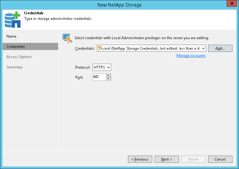 - From the Credentials list, select credentials to connect to the storage system. If you have not set up credentials beforehand, click the Manage accounts link or click Add on the right of the Credentials field to add the credentials. For more information, see Managing Credentials.