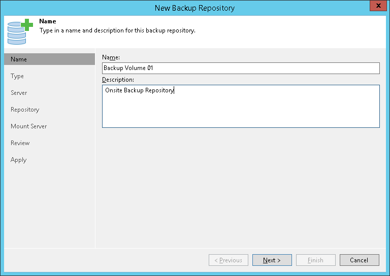 At the Name step of the wizard, specify a name and description for the backup repository.