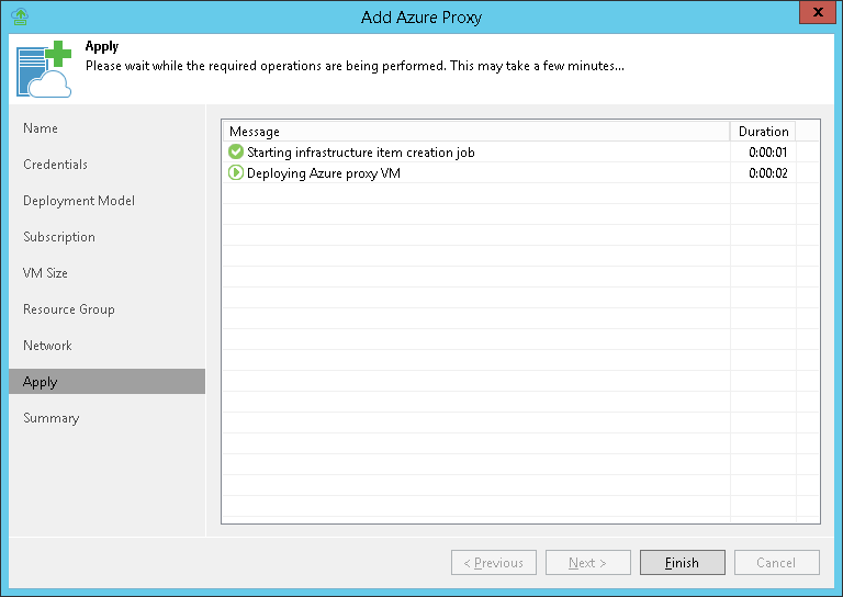 At the Apply step of the wizard, Veeam Backup & Replication will deploy the Azure proxy with the specified settings. You can view the deployment progress in the real-time mode.