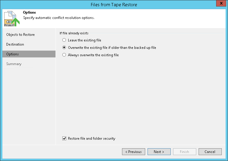 - Always overwrite the existing file. Select this option if you want to overwrite the existing file with the restored file in all cases.