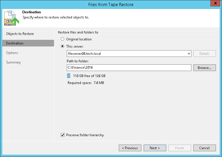 When restoring files to a location other than original, Veeam Backup & Replication preserves the folder hierarchy. To restore files to the specified target folder without keeping the folder structure, clear the Preserve folder hierarchy check box.