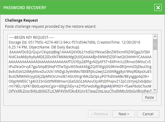 - Paste the request that you have received from the Veeam Backup Administrator. You can use the [CTRL+V] key combination or click Paste at the bottom of the wizard.