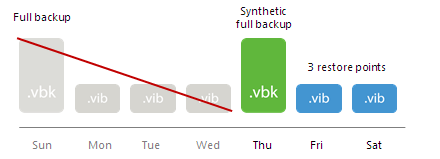 For example, the retention policy is set to 3 restore points. A full backup file is created on Sunday, incremental backup files are created Monday through Saturday, and a synthetic full backup is scheduled on Thursday. Although the retention policy is already breached on Wednesday, the full backup is not deleted. Without the full backup, backup chain would be useless, leaving you without any restore point at all. Veeam Backup & Replication will wait for the next full backup file and 2 incremental backup files to be created, and only then will delete the whole previous chain, which will happen on Saturday.
