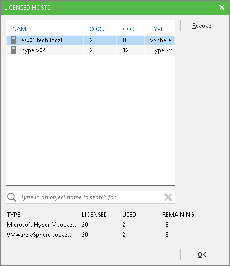 - In the displayed window, select a host or VM and click Revoke. Veeam Backup & Replication will revoke the license from the host or VM, and the license will be freed for other hosts or VMs in the backup infrastructure.