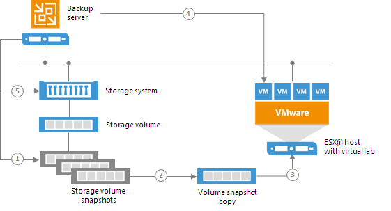 To start a VM from the storage snapshot in the On-Demand Sandbox, Veeam Backup & Replication needs to present this storage snapshot to an ESX(i) host as a datastore. To do this, Veeam Backup & Replication performs the following actions: