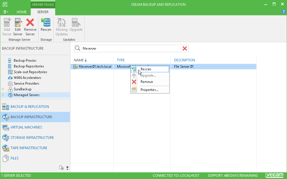 - In the working area, select the server or host and click Rescan on the ribbon. Alternatively, you can right-click the server or host and select Rescan.