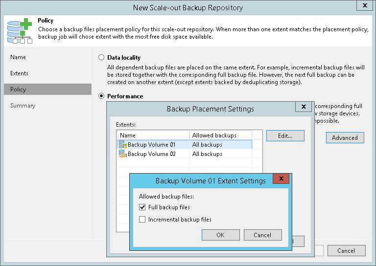 1. If you select the Performance policy, you can restrict which types of backup files can be stored on a specific extent. For example, if you have added three extents to the scale-out backup repository, you may want to store full backup files on one extent and incremental backup files — on the other two extents.