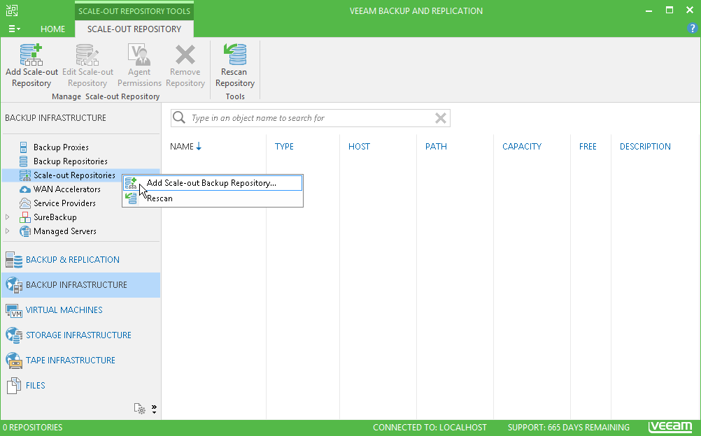 - Open the Backup Infrastructure view, in the inventory pane right-click Scale-out Repositories and select Add Scale-out Backup Repository.