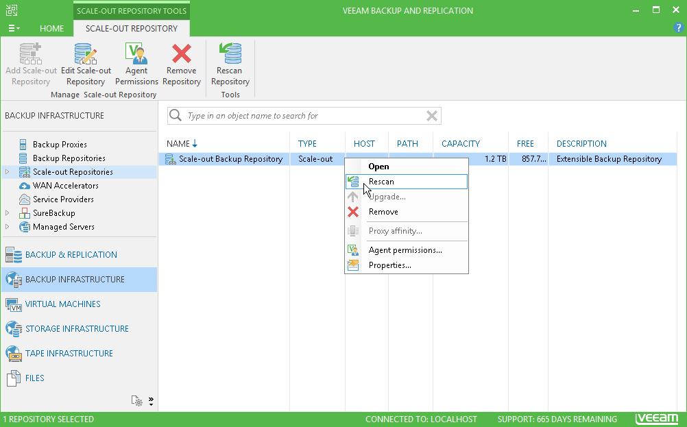 - In the working area, select the scale-out repository and click Rescan Repository on the ribbon or right-click the scale-out backup repository and select Rescan repository.