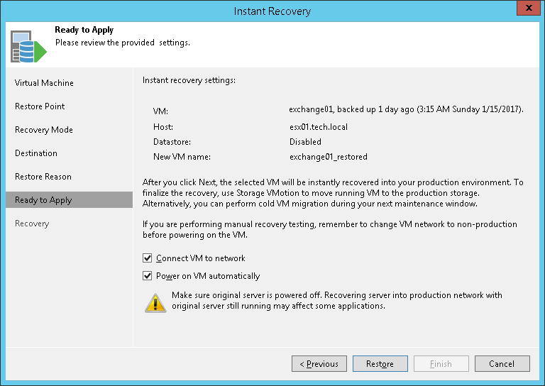 - If you are recovering a production VM that has failed and want to connect the recovered VM to a network upon restore, select the Connect VM to network check box. If you are recovering a VM for testing disaster recovery and the original VM is still running, leave this check box not selected. Before you power on the VM, you will have to manually change VM network configuration: disconnect it from the production network and connect it to an isolated non-production network to avoid conflicts.