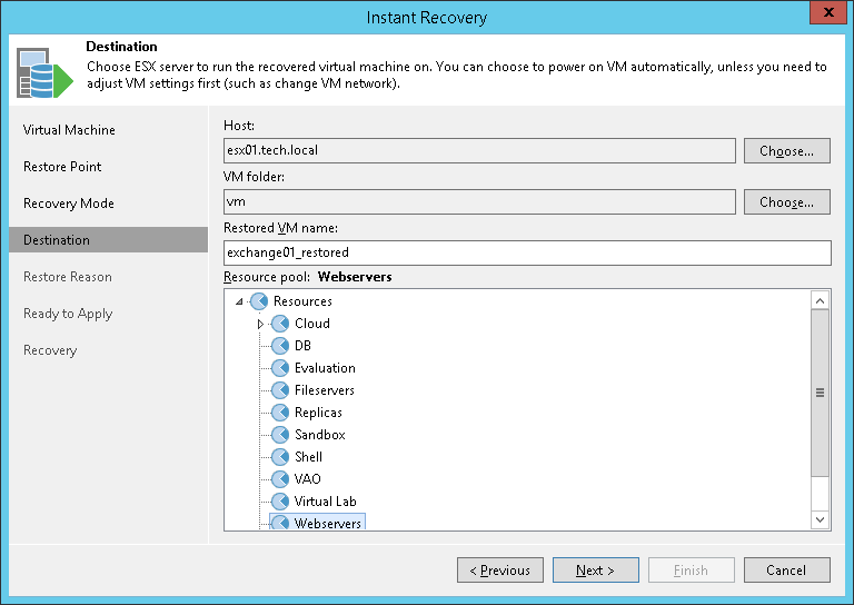 Select a destination for the recovered VM: