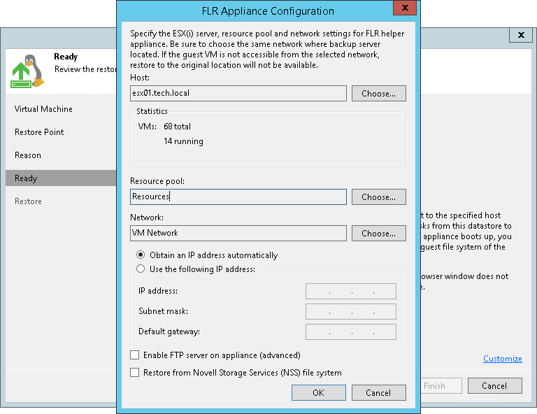 - If you are restoring a VM with the Novell Storage Services file system, select the Restore from Novell Storage Services (NSS) file system check box. Veeam Backup & Replication will deploy a specific proxy appliance that supports the Novell Storage Services file system.