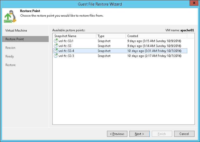 This is an archive version of the document. To get the most up-to-date information, see the current version. Step 3. Select Restore Point In this article At the Restore Point step of the wizard, select a restore point for the VM. Every storage snapshot acts as an independent restore point.