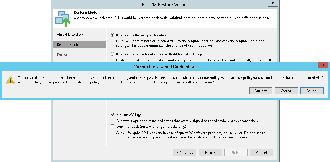 In some cases, the original storage profile may be changed or missing by the time when you restore the VM. For example, the storage profile may be deleted, the original VM in the production environment may be associated with another storage profile and so on. In such situation, Veeam Backup & Replication displays a warning and lets you choose one of the following scenarios:
