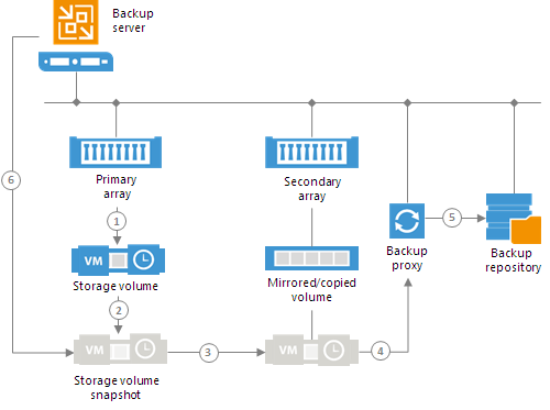 - Veeam Backup & Replication checks if there is a backup proxy that has a direct connection to the secondary storage array. The transported storage snapshot is mounted to this backup proxy.