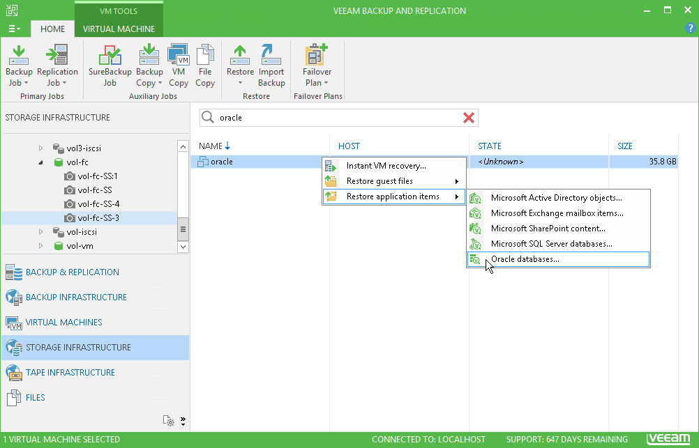 - Open the Backup & Replication view. In the inventory pane, select Storage snapshots. In the working area, expand the necessary volume, select a VM running Oracle and click Application Items > Oracle on the ribbon. You can also right-click the VM and select Restore application items > Oracle databases. In this case, you will pass immediately to the Restore Point step of the wizard.