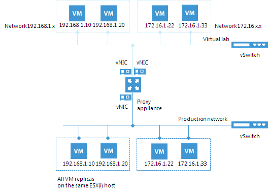 In the advanced single-host virtual lab, Veeam Backup & Replication creates several virtual networks. The number of virtual networks corresponds to the number of production networks to which verified VM replicas are connected. Networks in the virtual lab are mapped to corresponding production networks.