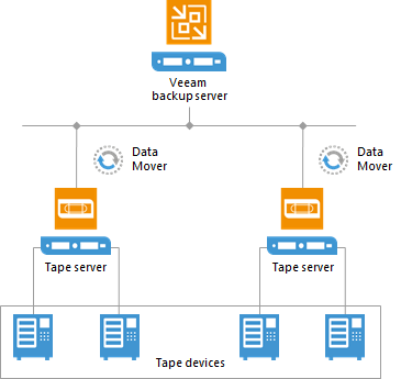 With Veeam Backup & Replication, the data transfer during archiving and restore processes is enabled with Veeam Data Mover services. The Data Movers run on tape servers and other components of backup infrastructure. They receive tasks from the Veeam backup server and communicate to each other to transfer the data.