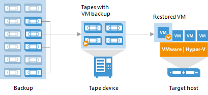 - The VM from tape restore job checks the Backup Catalog in the Veeam Backup & Replication database to discover the tapes containing the needed backup files. If the tapes are offline, Veeam Backup & Replication prompts the user to insert the required tapes.