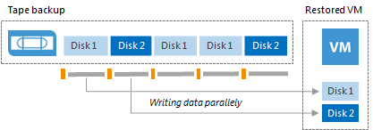 - Veeam restores the VM disks. Multiple disks are restored parallely. Veeam reads the tape consequently and, using the map of data blocks, copies the VM disks data.