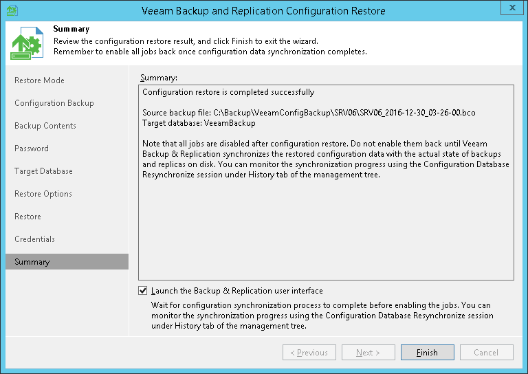 - If you want to start Veeam Backup & Replication after you finish working with the wizard, select the Launch the Backup & Replication user interface check box.