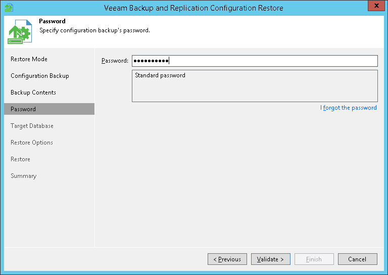 If the backup server is not connected to Veeam Backup Enterprise Manager and does not have the Enterprise or Enterprise Plus license installed, you will not see the I forgot the password link and will not be able to restore configuration data without a password. |