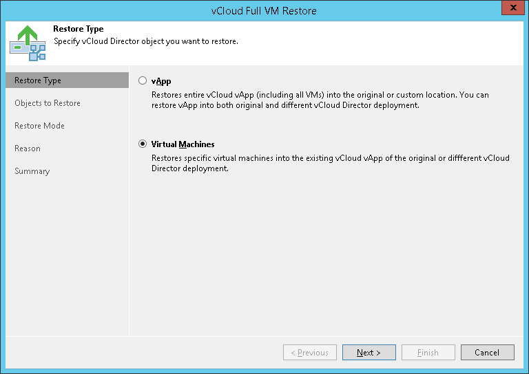 - On the Home tab, click Restore and select vCloud. At the Object Type step, select the object you would like to restore: VM.