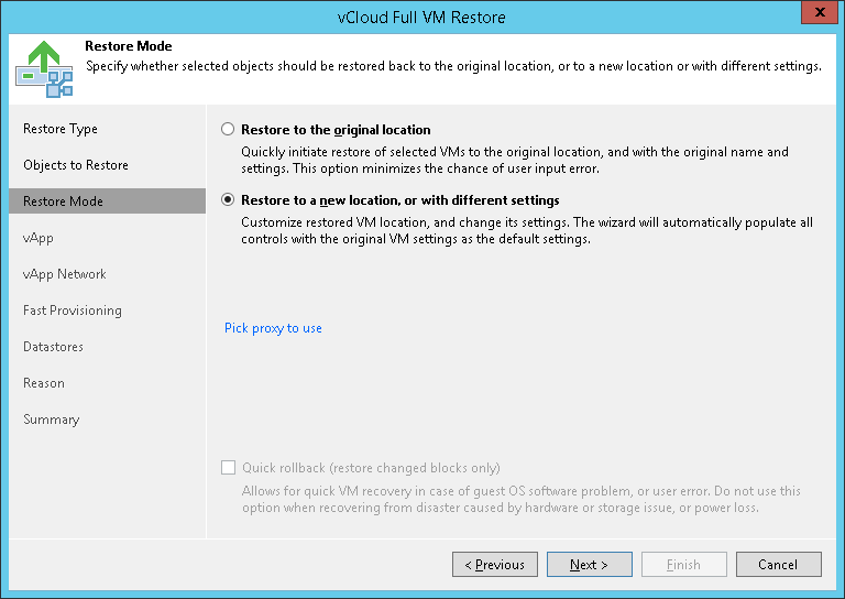 At the Restore Mode step of the wizard, choose the necessary restore mode and backup proxy for VM data transport: