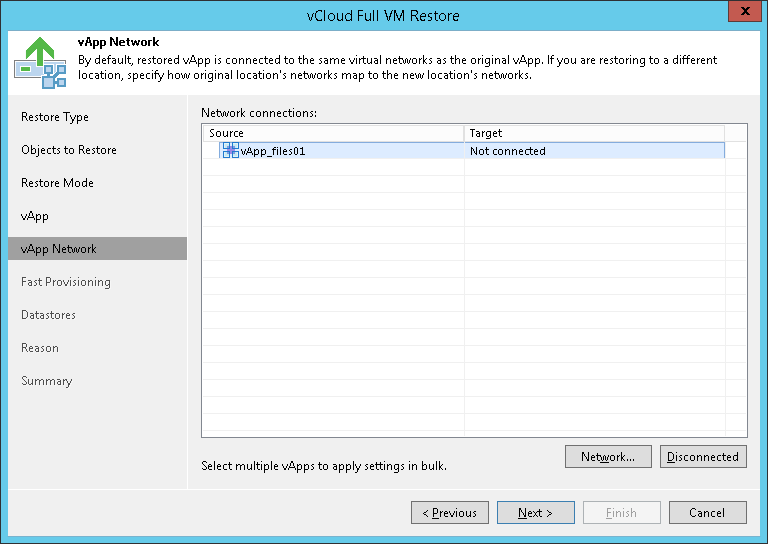 To prevent the restored vApp from accessing any network, select it in the list and click Disconnect.