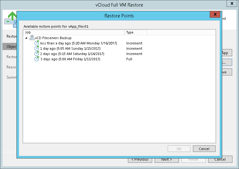 - In the Restore Points window, select a restore point that must be used to recover the vApp.