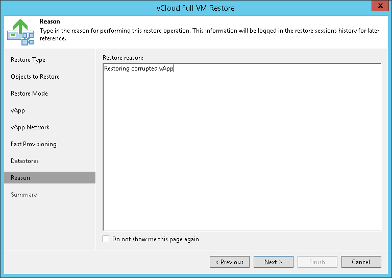 At the Reason step of the wizard, enter a reason for restoring the selected vApp. The information you provide will be saved in the session history and you can reference it later.