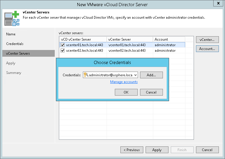 - Click Account on the right and select credentials to connect to the VMware vCenter Server. By default, Veeam Backup & Replication uses the same credentials that you have specified for VMware vCloud Director at the previous step of the wizard.