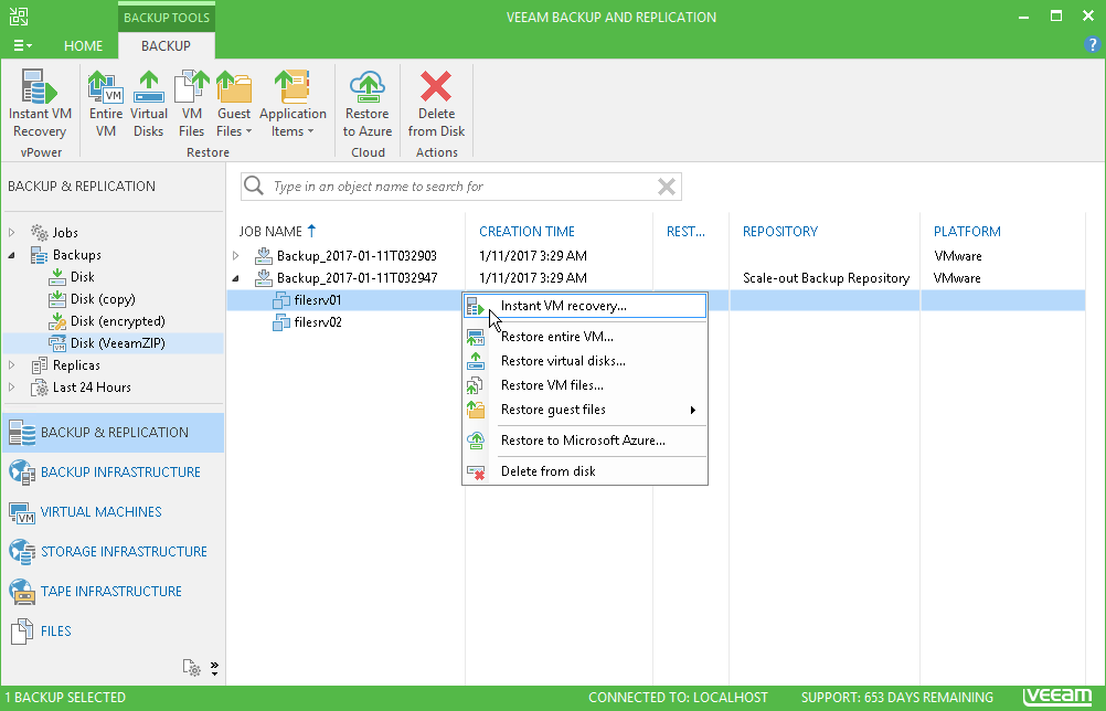 Backup files produced with VeeamZIP jobs are displayed in the Backup & Replication view, under the Backups > Disk (VeeamZIP) node. To restore VM data from the VeeamZIP file, you can right-click it in the Backup & Replication view and select the necessary restore option. You can also double-click the necessary VeeamZIP file on the machine where Veeam Backup & Replication is installed.