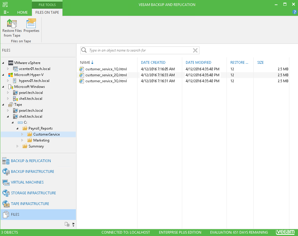 - Expand the Tape node and locate the files archive. Veeam Backup & Replication preserves the source hierarchy of folders for archived files. You can use the created archive for file recovery.