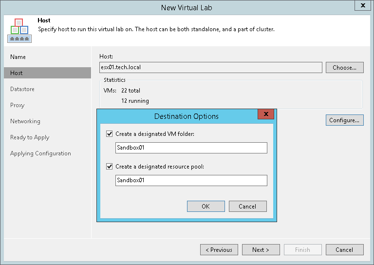 - For every new virtual lab, Veeam Backup & Replication creates a dedicated folder and resource pool on the ESX(i) host. By default, the folder and pool have the same name as the virtual lab. To change the name of the folder and/or resource pool, click Configure. In the Destination Options window, enter the necessary names.