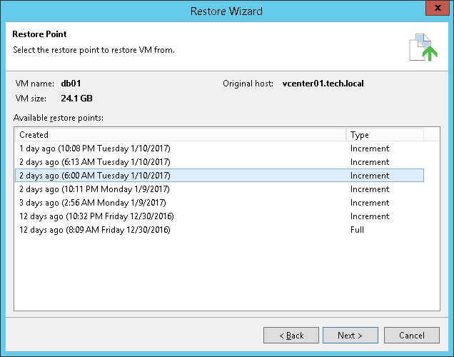 This is an archive version of the document. To get the most up-to-date information, see the current version. Step 3. Select Restore Point In this article At the Restore Point step of the wizard, select the restore point from which you want to restore the VM file(s).